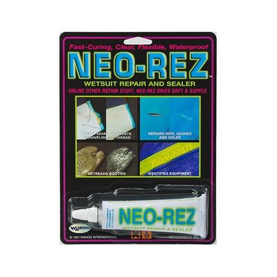 NEO-REZ is a fast-curing, clear synthetic that works great to repair neoprene wetsuits. Unlike other sealers or patches that take hours or even days to cure, NEO-REZ is dry to the touch in about 20 minutes and can be put into use in about two hours. When throrughly cured, NEO-REZ is totally waterproof and incredibly strong yet soft and supple.
